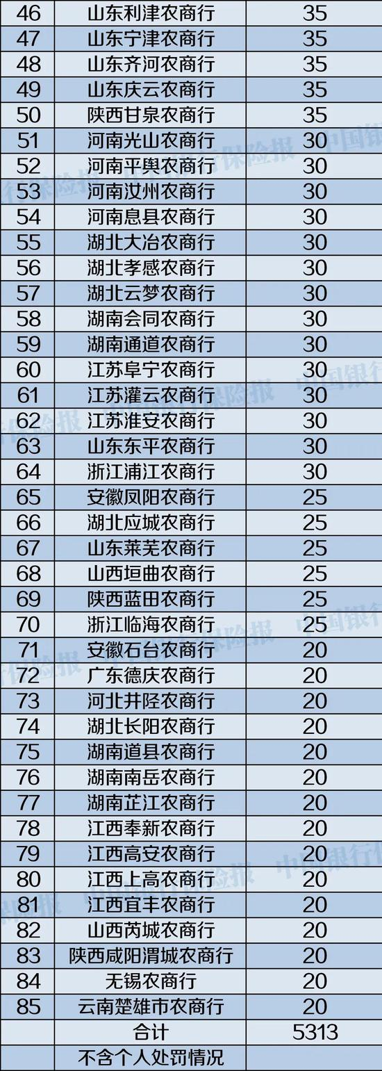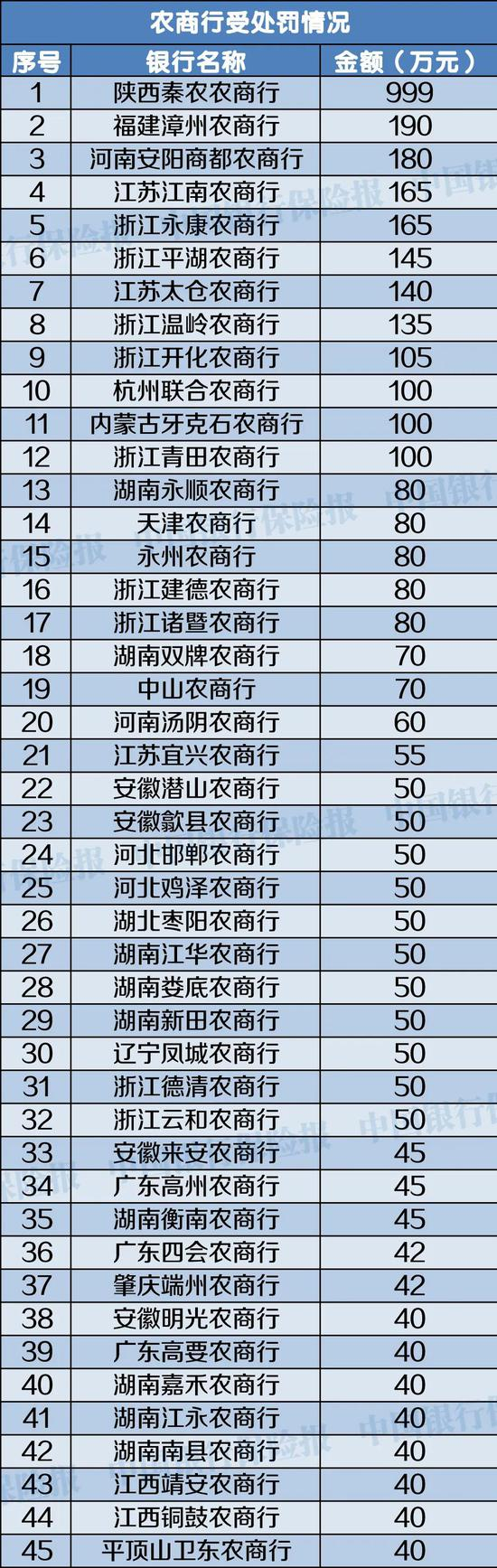 陕西秦农农商行、福建漳州农商行和河南安阳商都农商行以999万元、190万元和180万元的罚款排在农商行前三。