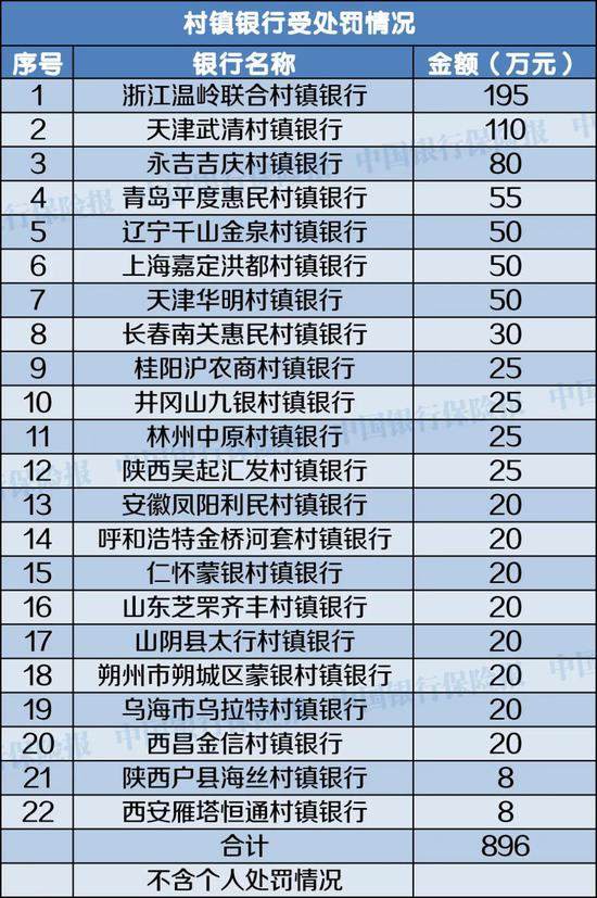 浙江温岭联合村镇银行、天津武清村镇银行和永吉吉庆村镇银行以195万元、110万元和80万元的罚款排在村镇银行前三。