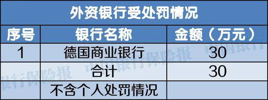 1月份,有1家外资银行受到处罚。德国商业银行违规发放汽车贷款被罚款30万元。