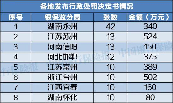 在银保监分局方面,永州以42张行政处罚决定书排第一,苏州、信阳以13张排在第二三位。苏州以524万元的罚款排在第一,台州、常州以502万元、389万元排在第二三位。