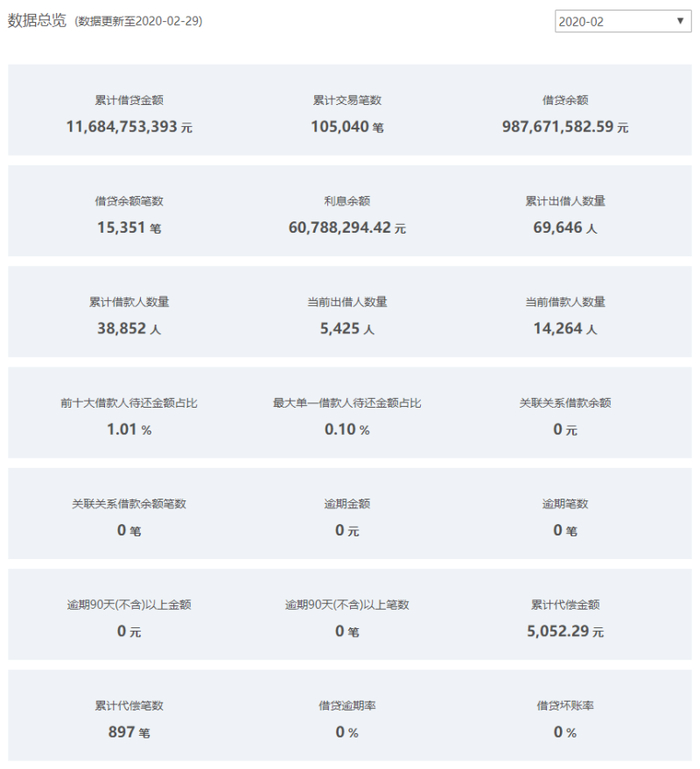 据希望金融披露,截至2月29日,其借贷余额9.88亿元,累计代偿金额5052.29元,逾期金额及借贷逾期率等均为0。