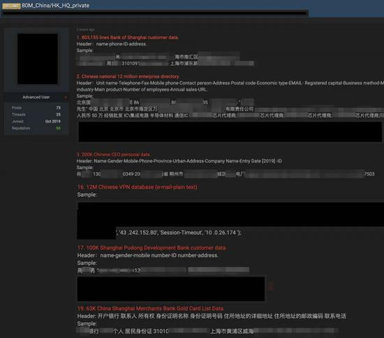 根据网络上爆料信息,这些被泄露数据涉及上海银行 80万行客户数据、46万中国兴业银行信用卡资料、20万上海理财VIP客户数据、10万上海浦发银行客户资料等。
