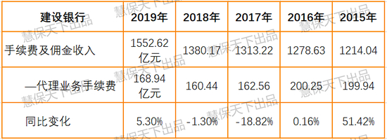 2019年,建设银行代理业务手续费收入168.94亿元,增幅5.30%,主要受益于代理保险和承销债券业务增长带动。