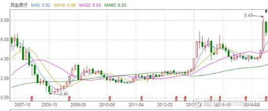 前有业绩支撑,赚钱赚到不好意思;后有资金关注,国有资金、民营资本争夺股权,民生银行的股价开启了腾飞之路,从2011年底大约2块钱上涨至2014年的大约8块钱。
