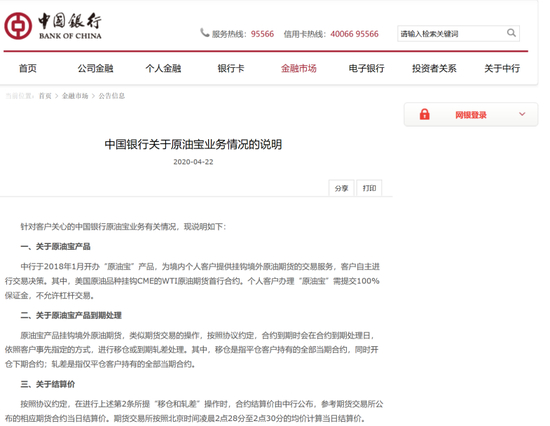引发争议后,4月22日晚间,中行发布了关于“原油宝”业务情况的五点说明,并就投资者提出的部分质疑做出了回应。随后,中行方面公告称:“将依法合规处理相关业务后续事宜。”