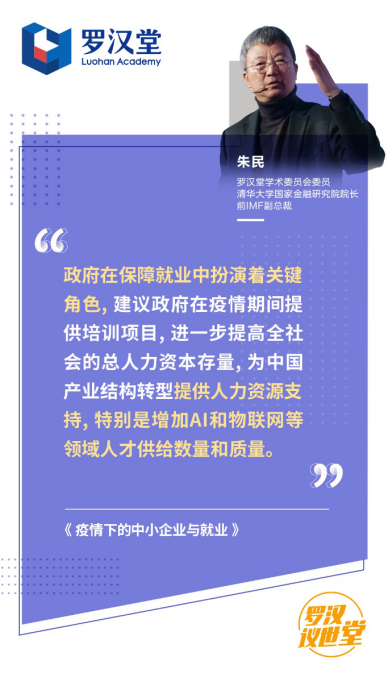 朱民建议,政府在保障就业中扮演着重要角色,建议政府在疫情期间提供培训项目,进一步提高全社会的总人力资本存量,为中国产业结构转型提供人力资源支持,特别是增加AI和物联网等领域人才供给数量和质量。