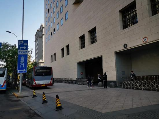 在大楼北门,两辆空置公交车停在路边。而在西门,空置公交车的数目为6辆。其中,部分公交车中坐满穿着制服的人员。