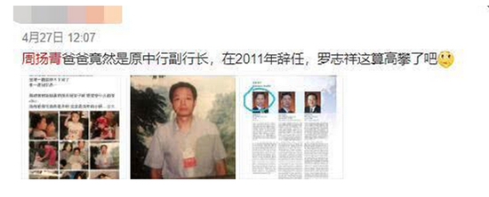 更没想到的是娱乐圈的瓜竟然还会蔓延到金融圈。有网友根据周扬青的小小号发布的照片,扒出她的父亲竟然是原中国银行副行长周载群,不过这一消息很快就被证实为不实消息。