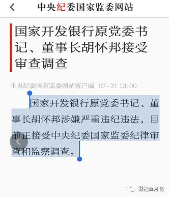 2019年7月31日,中纪委国家监委发布公告称,国家开发银行(下称“国开行”)原党委书记、董事长胡怀邦严重违纪违法,目前正在接受中纪委国家监委纪律审查和监察调查。