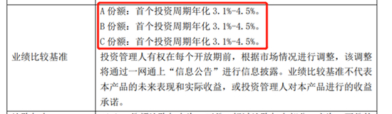 值得注意的是,尽管招行客户经理发给新浪财经的产品宣传页上大字写着7.8%的字样,但在其详细的产品说明文件中,却将该产品的业绩比较基准列示为了3.1%-4.5%,而该业绩基准并未在出现在产品宣传页中。