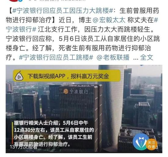 5月6日,一位宁波银行员工跳楼轻生,永远地告别了这个世界。