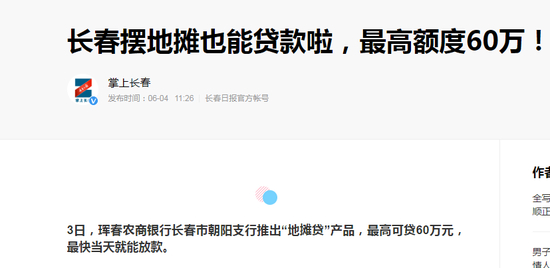 值得一提的,目前市面上推出“地摊贷”的银行并非山东临淄农商行一家。据长春日报官方账号“掌上长春”发布消息显示,6月3日,珲春农商行长春市朝阳支行便已推出了“地摊贷”产品,最高可贷60万元。