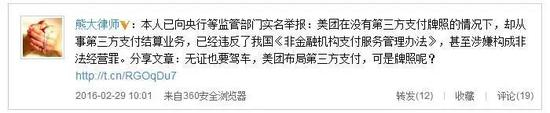 “无牌经营”解决不久,美团支付业务再次被律师举报违规。