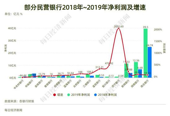 此外,每日经济新闻记者注意到,净利润增速超过100%的有6家,分别为苏宁银行2032.60%、振兴银行476.92%、富民银行313.21%、新网银行207.88%、三湘银行108.5%、众邦银行108%。