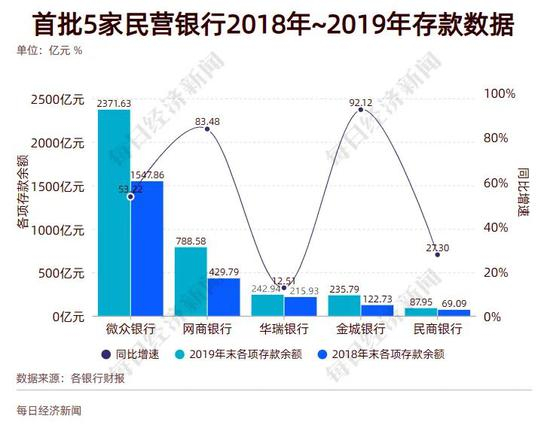 2019年三湘银行、新网银行、众邦银行和富民银行存款增速分别为146.53%、95.95%、57.31%和41.68%。