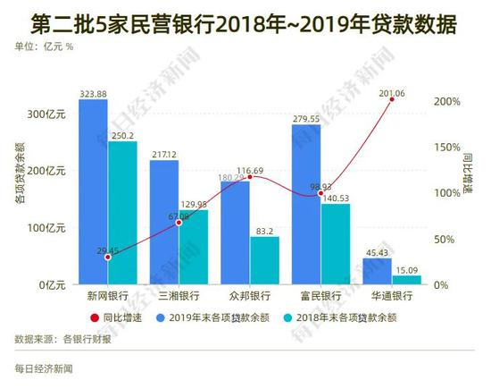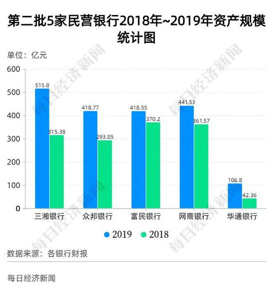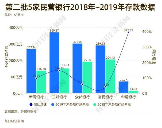 2016年年末,监管批准了6家民营银行的筹备,分别是富民银行、新网银行、三湘银行、新安银行、华通银行、众邦银行。去掉官网未披露年报的新安银行,每日经济新闻记者对第二批次中的5家民营银行2019年存款数据进行梳理。