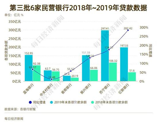 在贷款方面,每日经济新闻记者将16家民营银行银行分为三个批次分别统计了2019年年报,梳理出各民营银行贷款规模和增速。
