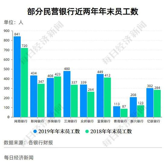 每日经济新闻记者统计梳理了9家民营银行(部分银行数据不全)2019年薪酬和员工数据。