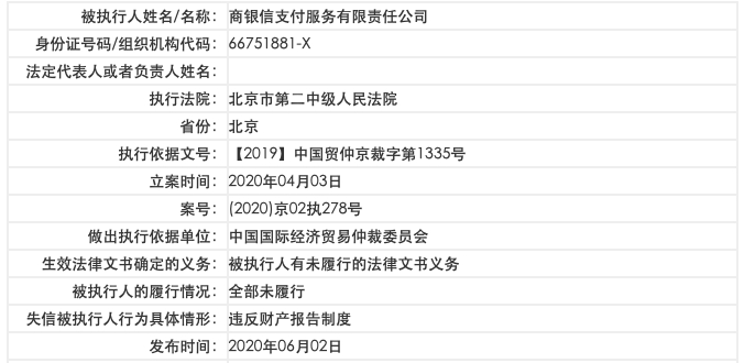 中国执行信息公开网显示,因此前的被执行义务未履行,商银信被列为失信被执行人,相关信息在6月2日发布。4月3日,商银信被北京市第二中级人民法院要求执行1.236余亿标的,案号为(2020)京02执278号。商银信与北京国石天玺投资有限公司(下称 “国石天玺”)以及玖富数科科技集团有限责任公司存在纠纷。其中,国石天玺与其存在1亿借款本金的纠纷,尚无信息显示执行信息涉及该借贷纠纷。