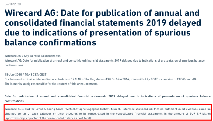 在原定财报发布日,当地时间6月18日,德国支付巨头Wirecard AG(XETRA:WDI)公告称,公司的审计方Ernst&Young(下称 “安永”)旗下审计师告知,无法获得足够的审计证据证明,信托账户的现金余额将被合并到19亿欧元的合并财务报表中,约占合并资产负债表的四分之一。