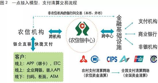 农信机构数量多、规模小、技术实力相对薄弱,在接入金融市场基础设施建设的过程中,存在着入网及后续运营管理等多方面的难题。农信机构“一点接入”农信银系统就可以进入金融市场,从而将地方性农信机构与全国性金融市场连接起来,促使农信机构具备相对平等参与金融市场竞争的能力(见图1),为广大农村地区客户提供更加全面、高效的金融服务。“一点接入”金融基础设施新型聚合联网模式通过集成创新,以农信银支付清算系统为基础,充分复用已有的网络、安全、系统等技术设施,在其上叠加处理多种业务,彻底改变“一种业务一个系统一次联网”的状况。同时农信银中心发挥集约优势和规模优势,主动承担交易集中、数据集中带来的安全生产风险和运营管理职责,组织、协同农信机构“一点接入”网联清算平台、银联无卡支付系统、人民银行国库信息处理系统、票据交易系统、人民币跨境支付系统等金融基础设施,构建“金融市场-金融基础设施-农信银系统-农信机构-客户”的交易链条。个人或企业客户“一点接入”农信机构,通过快捷支付或银企直联业务即可开展各类线上线下业务;而农信机构通过“一点接入”农信银中心亦可快速连通各个金融基础设施完成全部业务的清算交易(见图2)。