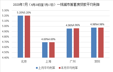 2020年7月(数据监测期为2020年6月20日-2020年7月17日),北上广深的首套房贷利率平均水平均未发生变化,二套房贷利率仅广州有所变动,较上期水平环比下降4BP。但具体到银行来看,广州地区多家银行调整了房贷利率水平,北京地区也有几家银行调整了二套房贷利率。