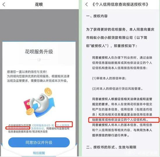 客服还表示,目前花呗是邀约制,首先是优质客户,未来会对用户全量覆盖;接入征信后,花呗数据会每月合并上传一次;在选择是否升级时,如果不同意升级,暂时不会影响花呗使用,但如果同意升级,数据就一定会上报征信,除非取消花呗的使用。