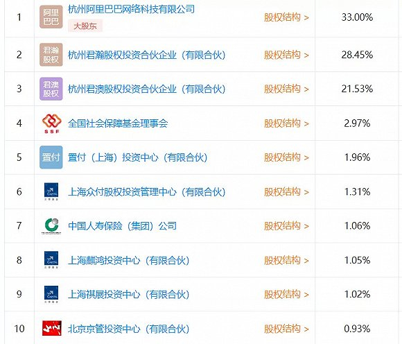 赢家都有谁:阿里系持大,国家队紧跟其后