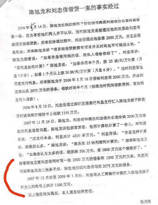 2006年5月16日,一个让刘忠信终生难忘的日子。就在这一天,心情复杂的他,从办公桌拿出信笺,为了帮朋友周转,他向陈旭龙借款2075万元(其中75万元是利息),并以公司作为担保,在借条上盖上公司公章,并签上自己的名字。