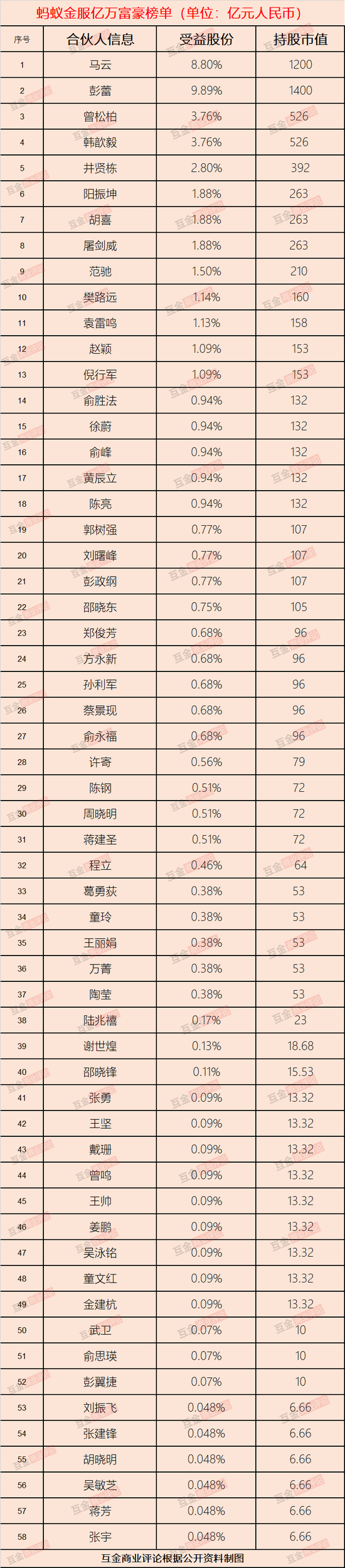 互金商业评论根据公开信息统计,蚂蚁金服上市后,蚂蚁金服和阿里系高管将诞生至少58名亿万富翁,最高身家1400亿元,最低身家6.66亿元。其中,过百亿的有22人,200亿以上的9人,其中,500亿以上的4人;50亿以上的37人。