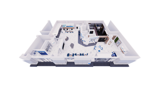 (6)贵宾服务——舒适安全。智能网点入口处的VIP客户识别区域,可实时识别重要客户身份。洽谈卡座为高端客户提供半私密的理财服务,金融顾问手持PAD可随时为客户提供面对面服务。贵宾区高端、大气,但不奢华。2个理财室和1个现金柜台向高端客户提供全品种、舒适的专属服务。无极调光灯膜可提供全色温的舒适照度,电动雾化玻璃门充分考虑客户隐私。互动展示屏采用多点触摸设计,方便金融顾问向客户提供及时信息资讯,后续还将实现远程金融理财专家在线支持。贵金属展柜应用虚实结合技术,把贵金属信息多角度、更直观的展示给客户,提升客户购买意愿,同时展柜内部还可以摆放贵金属实物。