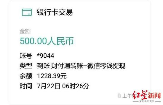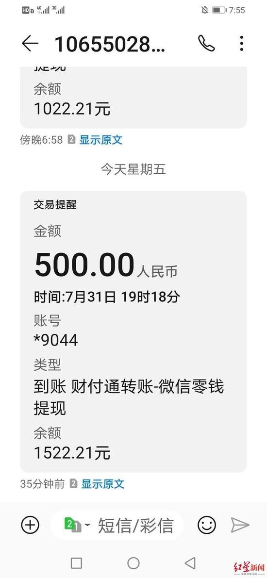 7月31日19时18分,该副卡又收到一次500元的账户提现短信。