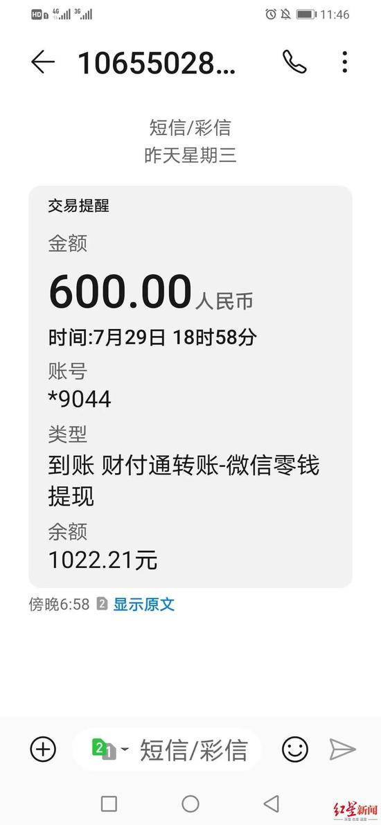 7月29日下午6点58分,小赵再次收到“微信零钱提现到9044账号,金额为600元,账号余额为1022.21元”的短信。