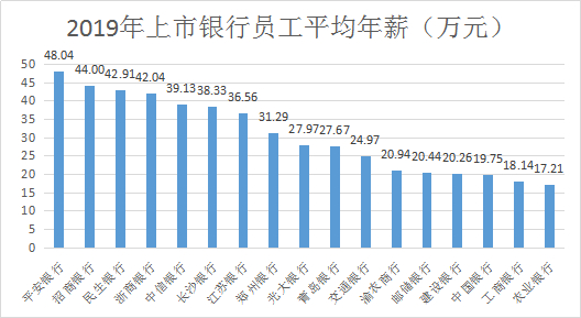根据部分上市银行披露的2019年年报计算,这是上市银行员工的年均薪酬(包括工资、奖金、津贴、补贴)超过22万元,其中平安银行以人均48万元的年薪遥遥领先。