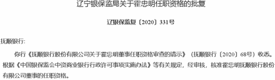 对于此次行长招聘,抚顺银行表示,“共有16人报名,招聘程序共有10个环节,历时9个月。”今年1月,在经辽宁银保监局核准任职资格后,霍忠明正式履职抚顺银行行长。