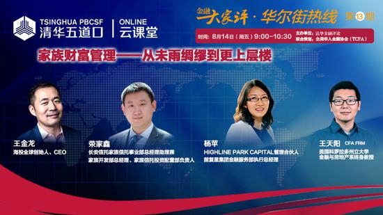 8月14日(周五)上午9:00,华尔街热线(第13期)特邀海投全球创始人、CEO王金龙,长安信托家族信托事业部总经理助理兼家族开发部总经理、家族信托投资配置部负责人荣家鑫,与Highline Park Capital管理合伙人杨苹、美国科罗拉多州立大学金融与房地产系终身教授王天阳,针对中美家族信托与家族财富管理展开中美对话!