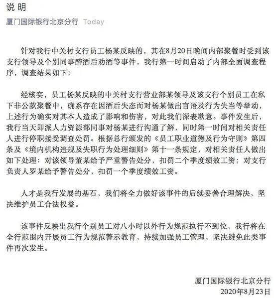 说明显示,针对该行中关村支行员工杨某反映的,其在8月20日晚间内部聚餐时受到该支行领导及个别同事醉酒后劝酒等事件,已经第一时间启动了内部全面调查程序。