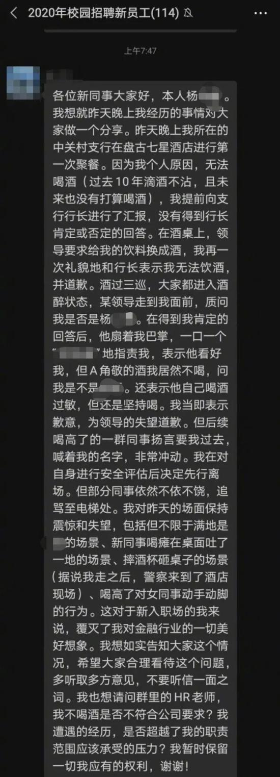 “这对于新入职场的我来说,覆灭了我对金融行业的一切美好想象。”小杨在群里发问,不喝酒是否不符合公司要求?我遭遇的经历,是否超越了我的职责范围应该承受的压力?