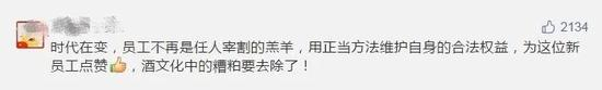 也有网友认为,该事件的核心不在于酒桌文化,而是以酒为介质的职场倾轧。有网友认为,应该支持员工依法维护自身合法权益,并为这位敢于挑战的新员工点赞。