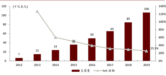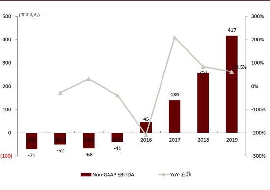 2019年公司GPV(平台交易量)达到1,062亿美元(12-19年 CAGR 49%),营业收入达到47亿美元(12-19年CAGR 57%),Adjusted EBITDA达到4亿美元(16-19年 CAGR 110%)。公司于2015年底上市以来股价增长已近20倍,当前市值约700亿美金,估值对应于2019年150x EV/EBITDA、23x P/S。