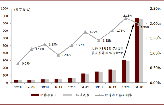 ► 战略业务:硬件产品是Square To B生态布局线下支付入口的战略业务。从财务角度来看,硬件业务亏损额不断扩大,、但在总营收中的占比较低,规模效应下成本可控。比特币是Square推动Cash App快速获客的战略业务,也是Square在To C生态金融服务领域的重要布局。由于Square采用在购买成本之上加价销售的商业模式,比特币业务毛利率较低、近两年来波动上升至2%左右,疫情期间,受益于比特币价格的大幅上升,Square比特币业务快速增长,2Q20该营收环比增长186%。