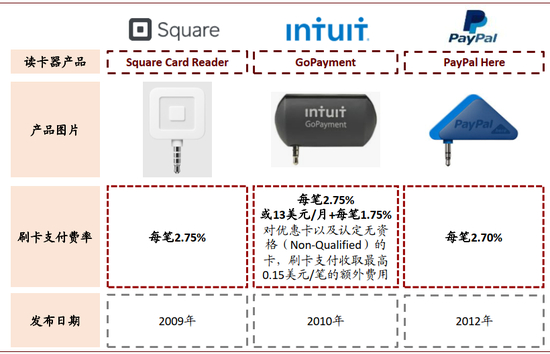自2011年2月起,Square建立了稳定透明的价格体系:从每笔刷卡支付交易中抽取2.75%的手续费,从每笔无卡支付交易(manually enter/card-not-present)中抽取3.5%+0.15美元/笔的手续费,除此之外无额外附加费用。与竞争对手复杂的费率体系相比,Square进一步降低了中小商户的使用门槛和成本,形成差异化竞争优势。而PayPal虽然在刷卡支付费率上有相对优势,但是发布第一款产品的时间落后Square三年。