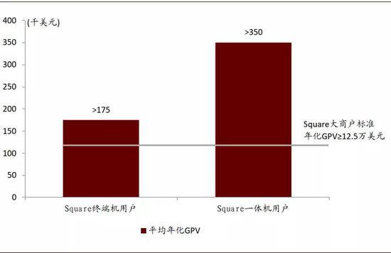 图表: Square终端机和Square一体机的用户年化平均GPV均高于12.5万美元(Square对大商户的认定标准)