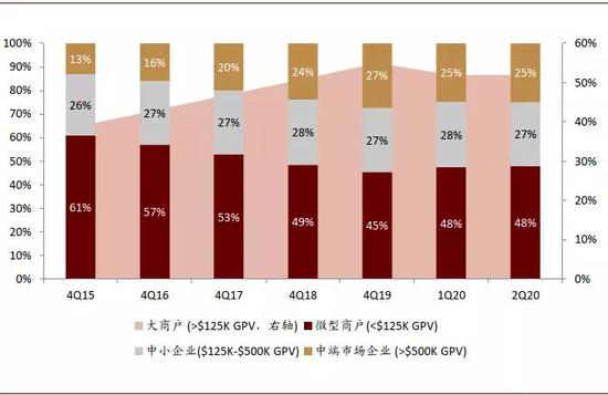 ► Square纵向深耕特定行业,为占GPV比重最大的餐饮业(26%)和零售业(17%)分别设计定制化的Square POS系统(Square for restaurant 和 Square for Retail),满足了商户的差异化需求,吸引了更多高GPV的大商户——18年二季度Square餐饮业POS系统(Square for Restaurant)发布,当季使用该系统的商户平均年化GPV超过了65万美元,远高于Square对大商户的认定标准(年化GPV≥12.5万美元)。
