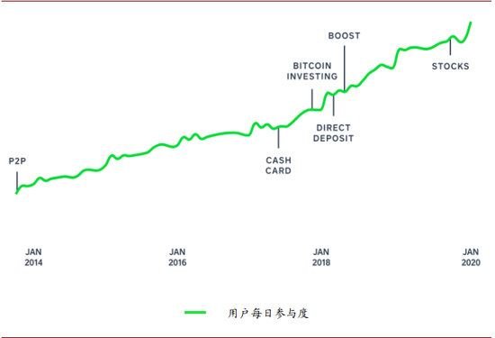 图表: 用户参与度随Cash App产品功能的丰富而提升