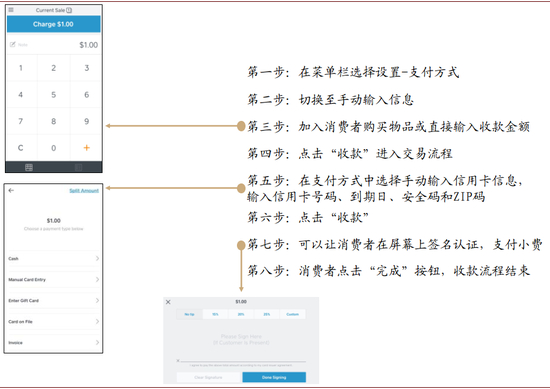 ► 线上支付服务:分为移动端收款(Square app)和PC端收款(Virtual Terminal),支持手动输入卡号(无卡支付)、礼品卡支付、老顾客卡片档案支付(card on file)、数字账单支付(Square Invoices),并提供消费者签名验证功能。
