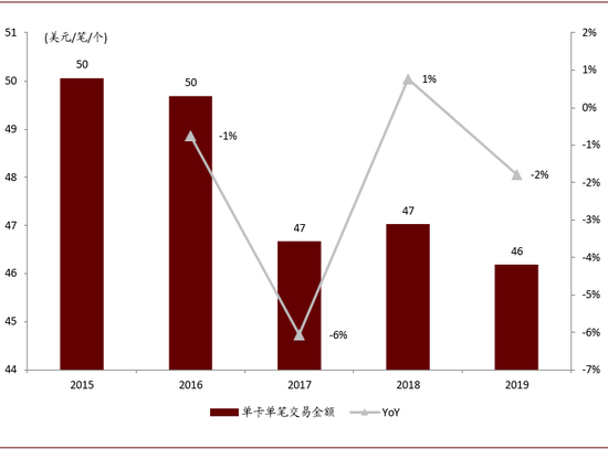 图表: Square 15-19年单卡单笔交易金额基本保持稳定