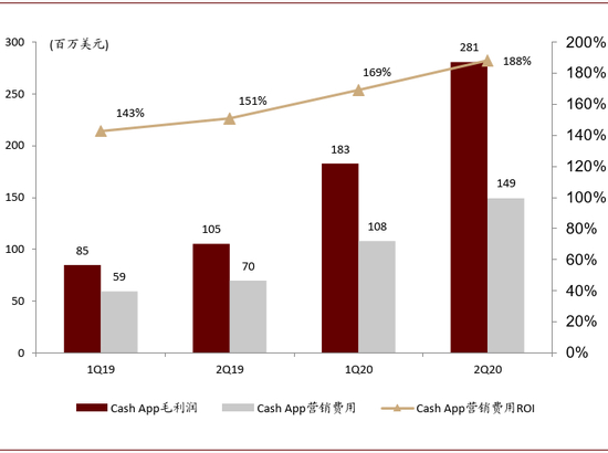 此外,随着Cash App用户数的快速增长以及营销投入的加速,16-19年Cash App的获客成本加速升高,但营销费用的投入产出比(ROI)亦持续上升。这表明在Cash App持续迭代的产品生态下,用户参与度的提升使其在获客成本快速走高时依然具有快速增长的盈利能力。