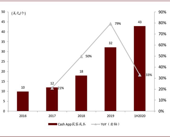在此基础上,Cash App借助P2P支付的网络效应、受益于“口口相传”的快速传播。同时,Square也持续加大对Cash App的营销投入,在总营销费用中的占比从2015年的8%提升至2020年上半年的59%,推动Cash App实现快速获客,2015年至今MAU月活用户数CAGR高达113%。