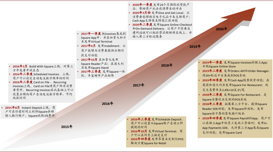 ► 拓展金融服务范围首次成为公司的发展战略,To C生态在提供支付、消费者分期付款功能(Square Installment)的基础上,添加了即刻到账(Instant Deposit)的功能,并分别于4Q2017、4Q2019在Cash App内上线了投资比特币和股票的功能;在To B生态中,为了减少Square Capital在贷款规模上受到合作伙伴的资金实力和购买意愿的限制,Square于1Q2020申请银行牌照并获得批准,我们预计,设立自有银行后将会进一步推动Square企业贷款和Square消费者分期付款的发展。